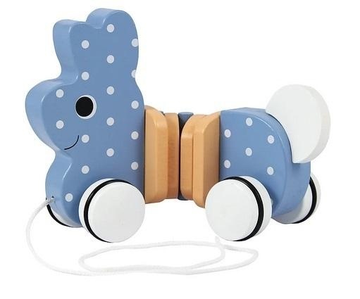Króliczek Wędrowniczek to zabawka wykonana z naturalnego drewna. Jest doskonałym towarzyszem dzieci stawiających pierwsze kroki. Znakomite rozwiązanie dla dzieci od 12 miesiąca życia. Króliczek Wędrowniczek wyposażony jest w sznureczek i małe drewniane kółeczka, dzięki którym zawsze podąża za swoim opiekunem. Wszystkie materiały wykorzystane do stworzenia zabawki posiadają atesty, a także zostały pomalowane nietoksycznymi farbami.