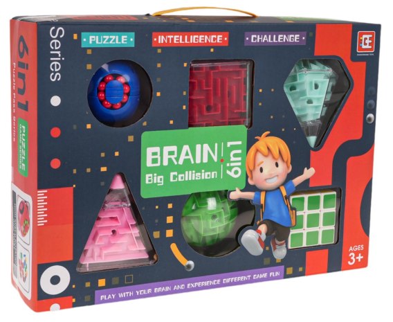 - owalny spinner z układanką i smyczką, - kostka rubika, - kostka z labiryntem i kulką, - 2 x piramidka z labiryntem i kulką, - kula układanka. |