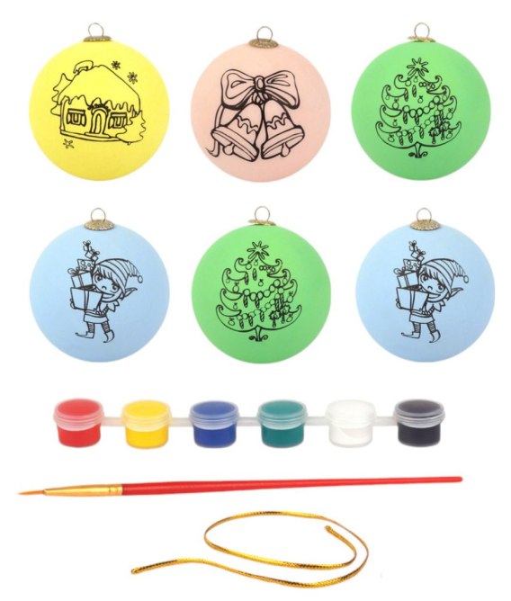 - 6 bombek choinkowych do malowania, - zestaw farbek z pędzelkiem, - dodatkowe sznureczki do zawieszania. |