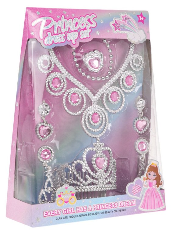 Bogato wyposażony zestaw małej księżniczki dla dzieci od 3-go roku życia. Zestaw wykonany został z dbałością o szczegóły i znajduje się w nim tiara, kolia, kolczyki oraz pierścionek. Każda mała dziewczynka poczuje się w nim jak księżniczka. Detale w tym zestawie wykonane zostały z plastikowych diamentów i imitacji kamieni szlachetnych, w srebrno-różowej kolorystyce. Wszystko zapakowane w pudełko, idealne na prezent. Funkcje zestawu: - bezpieczny dla dzieci od 3-go roku życia, - wykonany z dbałością o szczegóły, - bogato wyposażony. |