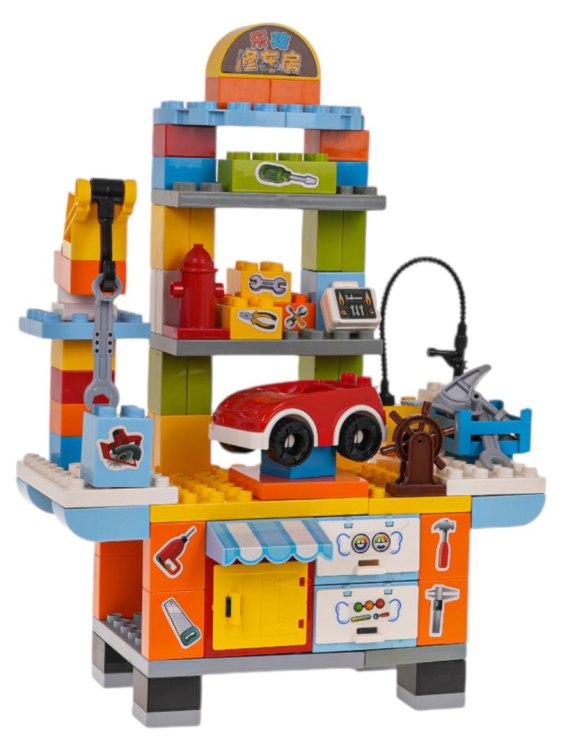 - klocki konstrukcyjne 110 elementów w tym: * autko, * skrzynka narzędziowa, * śrubokręty, * klucz francuski, * maszyna do pompowania kół, * podnośnik |