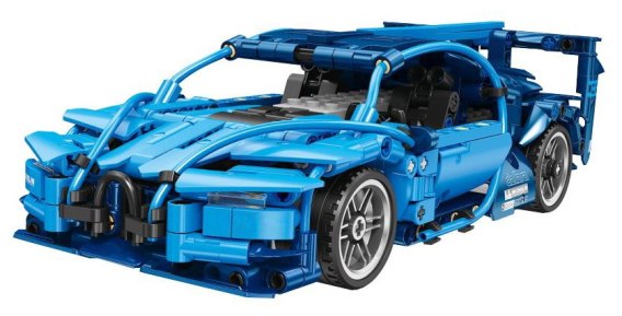 Zestaw 523 klocków konstrukcyjnych do samodzielnej budowy niebieskiego samochodu sportowego z funkcją zdalnego sterowania. Zabawka przeznaczona dla dzieci od 6-go roku życia. Klocki i elementy autka wykonane zostały z wysokiej jakości tworzywa sztucznego. Auto posiada ruchome elementy, jak otwierane drzwi i maskę.