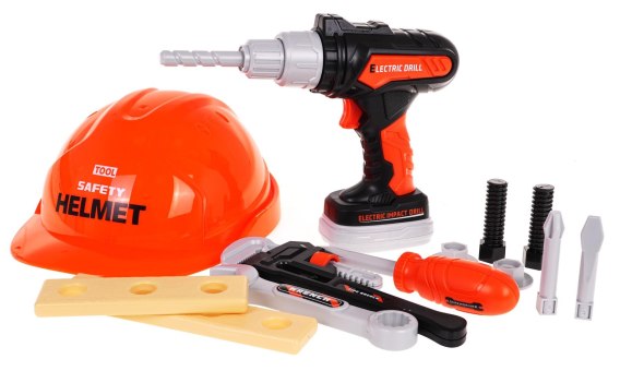 - kask ok. 22 cm x 17 cm x 9 cm, - wiertarka ok. 15 cm x 16 cm x 5 cm, - śrubokręt ok. 15 cm x 3 cm, - bit krzyżakowy i płaski oraz wiertło ok. 6,5 cm długości, - klucz francuski ok.17,5 cm x 5 cm x 1,5 cm, - klucz ok. 14 cm x 4 cm x 1,5 cm, - śrubki ok. 5,5 cm x 2 cm, - nakładki na śrubki ok. 3 cm, - deseczka mała ok. 12 cm długości, - deseczka duża ok. 16 cm, - opakowanie ok. 42 cm x 27 cm x 8 cm. |