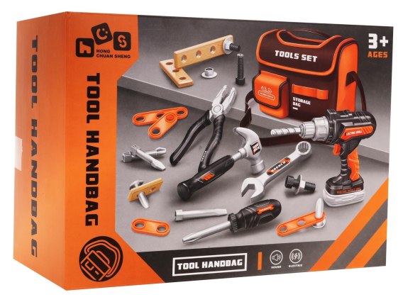 - torba na narzędzia ok. 23,5 cm x 16 cm x 10,5 cm, - wiertarko-wkrętarka ok. 15 cm x 15 cm x 5 cm, - wymienne bity: płaski, krzyżakowy, wiertło ok. 6,5 cm długości, - wymienne końcówki do śrubokręta ok. 8 cm długości, - nasadka do śrubokręta ok. 8 cm x 2,5 cm, - młotek ok. 17 cm x 8 cm x 2 cm, - klucz płasko-oczkowy ok.14 cm x 4 cm x 1,5 cm, - kombinerki ok. 15 cm x 5 cm x 1,5 cm, - mniejsze elementy do wkręcania ok. 6 cm x 2,5 cm, - większe elementy do wkręcania ok. 9 cm x 2,5 cm, - drewienko różnej wielkości do wkręcania ok. 6,5 cm długości, ok. 12 cm i ok. 16 cm, - śruba ok. 5,5 cm długości, - nasadki ok.3 cm średnicy, - kołki rozporowe ok. 5 cm x 3 cm, - opakowanie ok. 23,5 cm x 17,5 cm x 12,5 cm. |