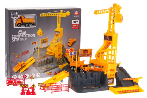- dźwig z placem budowy, - autko budowlane, - szlaban, - barierki - 6 x pachołek, - flagi, - znaki. |