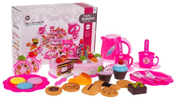 - 6 kawałków tortu ( w całości ok. ok. 8,5 cm x 15 cm), - 7 świeczek w tym jedna większa, świecąca (ok. 7 cm x 2 cm - świeczka duża, 4,5 x 0.5 cm - świeczka mała), - 12 bez (ok. 2 cm x 2 cm), - 5 wisienek (ok. 4,5 cm x 2,5 cm), - miś (ok. 6 cm x 3,5 cm), - 4 kiwi (ok. 2,5 cm x 2,5 cm), - 5 truskawek (ok. 2,5 cm x 1,5 cm), - 5 mandarynek (ok. 2,5 cm x 1,5 cm), - 5 pałeczek lukrowych (ok. 2,5 cm x 1,5 cm), - 2 babeczki (ok. 5 cm x 6 cm), - 11 różnych ciasteczek (różne kształty, wymiary ok. 6 cm x 5 cm), - 3 kawałki rolady (w całości ok. 7,5 cm x 7,5 cm x 6 cm), - 2 nożyki mniejsze (ok. 11 cm x 2 cm), - nożyk duży (14 cm x 2,5 cm), - 2 łyżeczki ok. 10 cm x 2,5 cm, - 2 widelce ok. 10 cm x 2,5 cm, - 2 kubeczki (ok. 5 cm x 7 cm), - roladka ok. 7,5 cm x 6,5 cm, - 4 talerzyki (małe ok. 10 cm średnica, duże ok. 13,5 cm średnica), - czajnik ok. 10 cm x 11 cm x 4 cm, - gwizdek - naklejki dekoracyjne. |