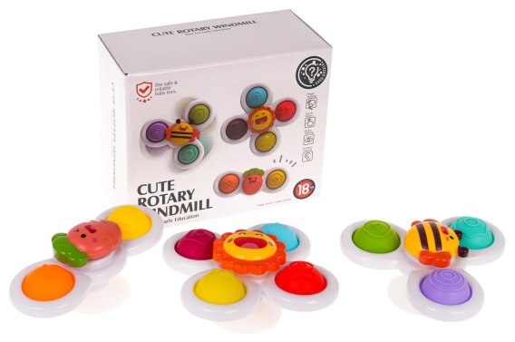 Zestaw spinnerów z przyssawkami, dla najmłodszych od 18-go miesiąca życia. Zestaw składa się ze spinnera ze słoneczkiem, pszczółką i marchewką. Na tylnej części zabawki znajduje się mocna przyssawka sprawiająca, iż zabawkę można przyczepić do różnych podłoży, np. na szybie, wannie czy stoliku. Zabawka jest wodoodporna, można ją używać podczas kąpieli, wytrzymałe łożyska zapewniają długotrwały i płynny obrót. Dzięki gumowym elementom do przyciskania maluch stymuluje zmysły, a jednocześnie się odpręża. Zabawki wykonane, ze świetnej jakości materiałów, w żywych kolorach.