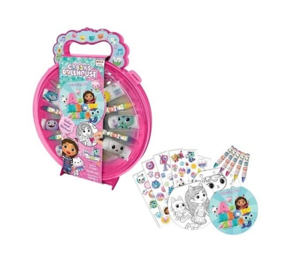 Zestaw do kolorowania z ulubionymi motywami Gabby's Dollhouse. Zawartość: 5 kredek, 8 zestawów naklejek, kolorowanka.