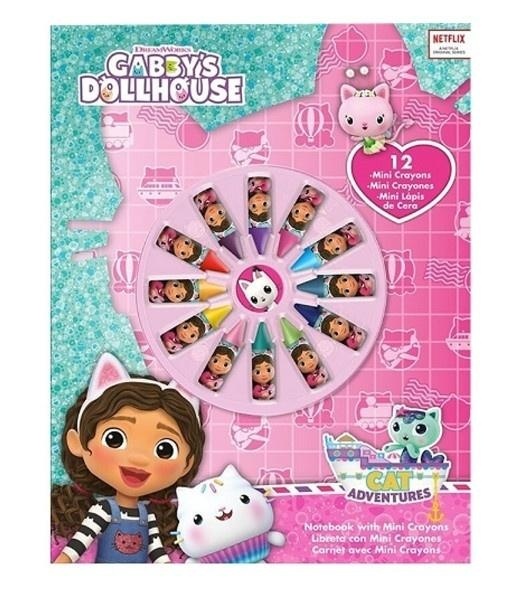 Zestaw do kolorowania z motywem Gabby's Dollhouse. Zawartość: 12 arkuszy do kolorowania, 12 mini kredek.