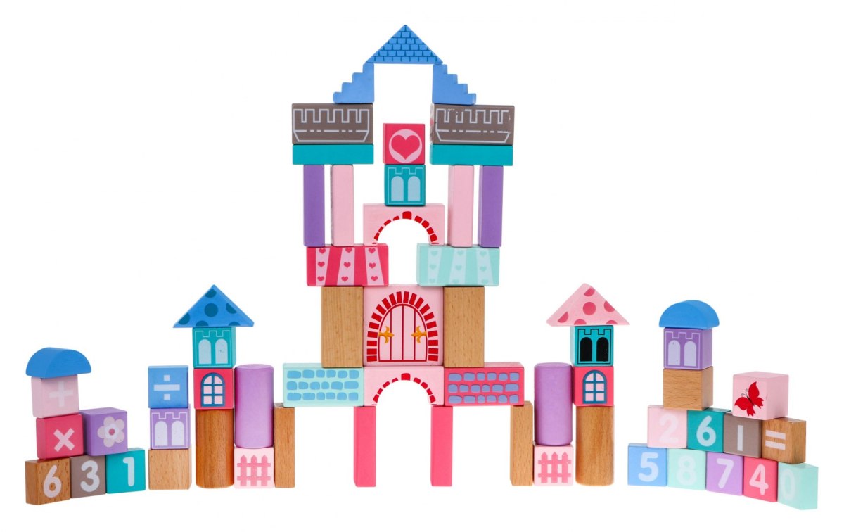 Zestaw malowanych drewnianych, bezpiecznych klocków z motywem księżniczki i zamku dla dzieci już od 3-go roku życia. Zestaw składa się z 67 elementów- klocków, w zestawie znajdują się też puzzle. Doskonała nauka kształtów, figur geometrycznych, oraz zabawa pobudzająca wyobraźnię i logiczne myślenie. Klocki zapakowane są w wiaderko, sorter na górze którego znajdują się otwory o różnych kształtach, do których należy dopasować odpowiednie klocki. |