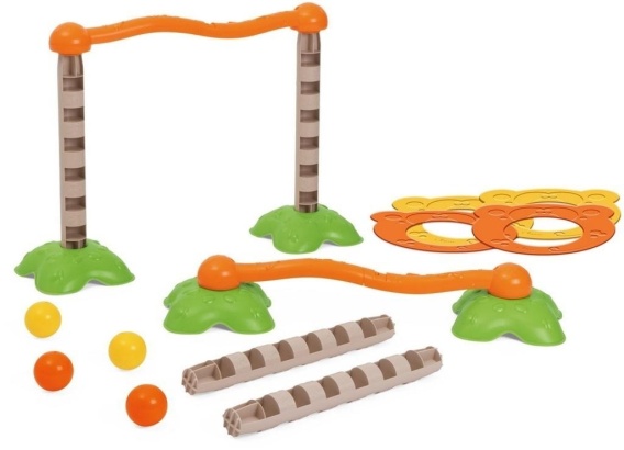 - Zestaw zawiera 18 elementów: 4 podstawy, 4 elementy pionowe, 4 pierścienie, 4 miękkie plastikowe piłki, 2 elementy poziome.