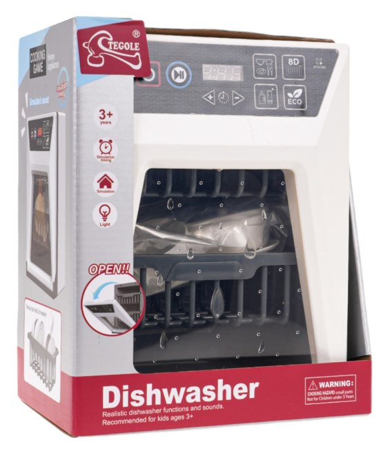 Interaktywna zmywarka do naczyń z funkcją dźwięku i światła dla dzieci od 3-go roku życia. Zmywarka wygląda jak prawdziwa i wydaje charakterystyczne odgłosy pracy. Wykonana została z najlepszej jakości materiałów, jest bezpieczna dla dziecka. Aby uruchomić zmywarkę, należy przycisnąć czerwony przycisk znajdujący się na panelu dotykowym i wybrać program, następnie przycisnąć przycisk play. Zmywarka zacznie wydawać odgłosy charakterystyczne dla wybranego programu i odliczać czas pozostały do zakończenia programu. Drzwi zmywarki są otwierane, a ze środka możemy wyjąć szufladę na naczynia. Do zestawu dołączono liczne naczynia i sztućce. Zabawka zasilana jest bateriami typu 2 x AA 1,5 V (brak w zestawie). Przyciski na panelu zmywarki: - start, - pauza, - wyświetlacz odliczający czas zakończenia danego cyklu, - przyciski z programami. Funkcje zmywarki: - odpowiednia dla dzieci od 3-go roku życia, - wykonana ze świetnej jakości materiałów, - zasilana bateriami, - odlicza czas danego programu, - funkcje dźwiękowe, - funkcje świetlne, - otwierane drzwi, - wyjmowany kosz na rzeczy do mycia, - akcesoria do mycia w zestawie. |